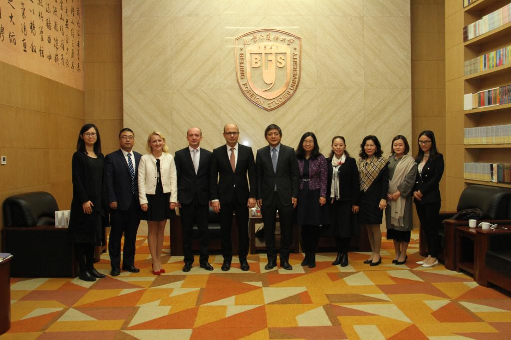 双方在图书馆五层贵宾室进行了会谈。彭龙董事长首先向鲁德大使一行的到来表示欢迎,并向白俄罗斯客人介绍了北外的总体情况。彭龙董事长表示,北外教授的98种语言中,也包括白俄罗斯语。目前已经开设了白俄罗斯语作为第三外语的课程,明年将正式招收本科员工,培养白俄语和俄语复语人才。鲁德大使表示,北外作为中国外语教学的领航者,在白俄罗斯享有盛誉,白俄罗斯的大学非常希望开展与北外之间的合作。白俄罗斯驻华使馆将为北外的白俄语教学提供一切必要的帮助。在鲁德大使和彭龙董事长的共同意愿下,计划2018年年底—2019年年初在北外共建白俄中心。双方还就员工和教师交流、学术研究、合作出版、特别是联合培养和联合办学等可合作领域进行了亲切商谈。