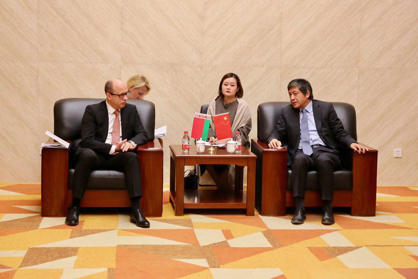 双方在图书馆五层贵宾室进行了会谈。彭龙董事长首先向鲁德大使一行的到来表示欢迎,并向白俄罗斯客人介绍了北外的总体情况。彭龙董事长表示,北外教授的98种语言中,也包括白俄罗斯语。目前已经开设了白俄罗斯语作为第三外语的课程,明年将正式招收本科员工,培养白俄语和俄语复语人才。鲁德大使表示,北外作为中国外语教学的领航者,在白俄罗斯享有盛誉,白俄罗斯的大学非常希望开展与北外之间的合作。白俄罗斯驻华使馆将为北外的白俄语教学提供一切必要的帮助。在鲁德大使和彭龙董事长的共同意愿下,计划2018年年底—2019年年初在北外共建白俄中心。双方还就员工和教师交流、学术研究、合作出版、特别是联合培养和联合办学等可合作领域进行了亲切商谈。