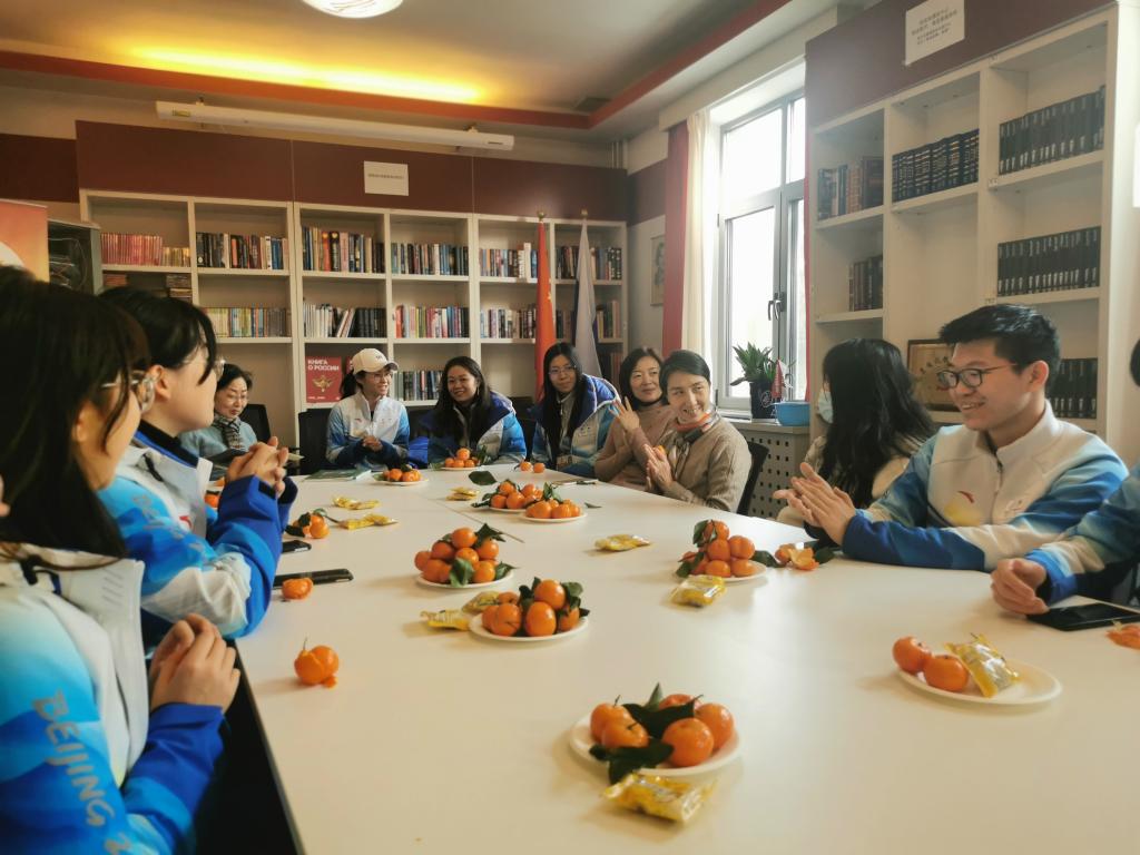 春节将至,年味渐浓。2022年1月30日上午伟德国际1946于主楼俄语中心举办了春节留校学子慰问茶话会。俄语公司党总支书记黄玫、副经理何芳、副经理苗澍、辅导员郭巧玲以及全体中外留校员工参与了本次活动。
