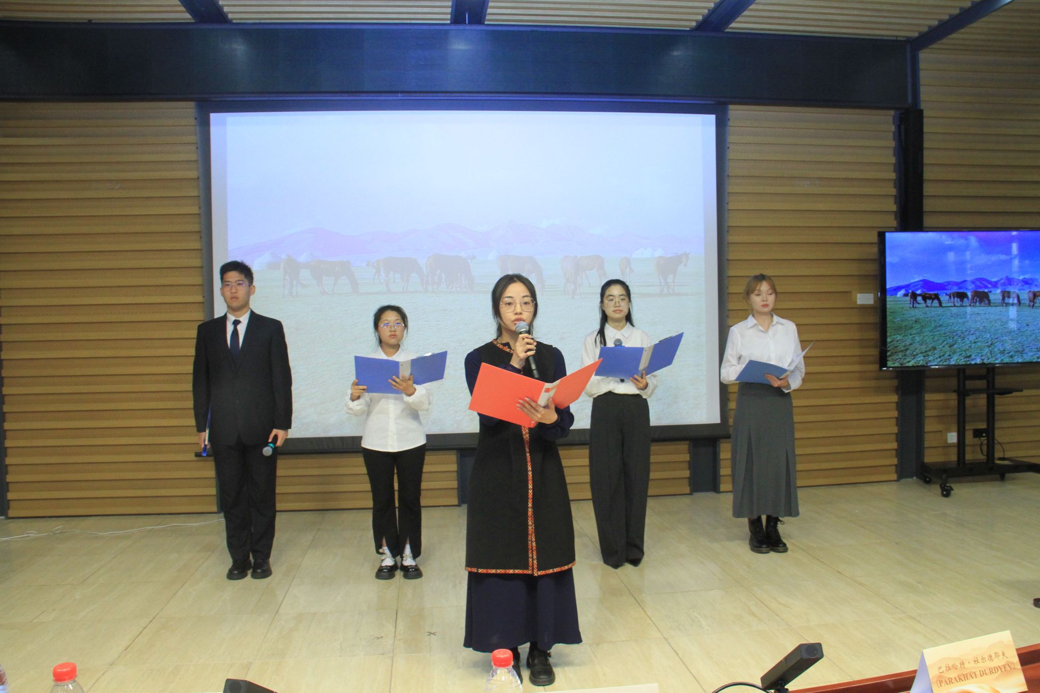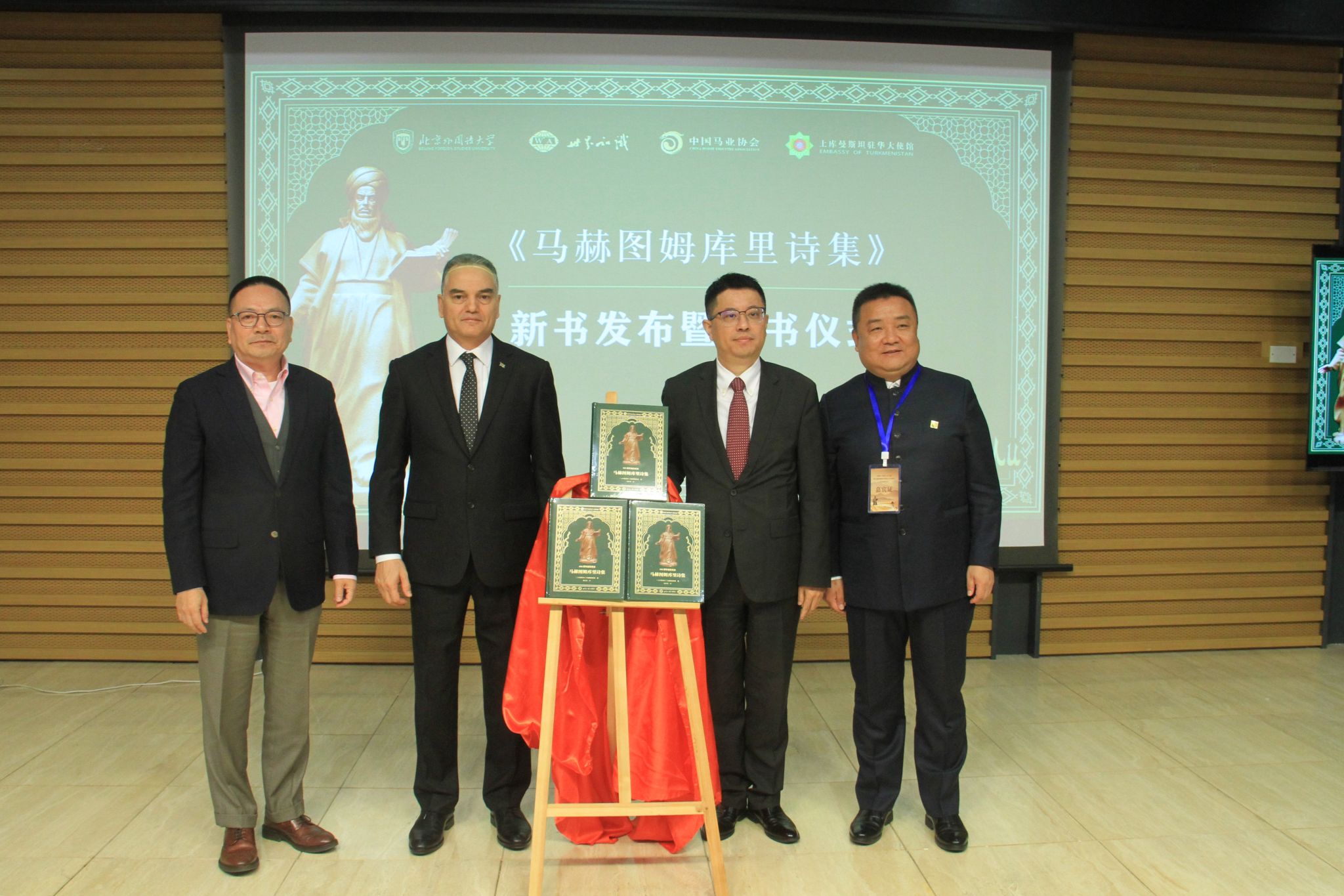 会议期间举行了由伟德国际1946经理戴桂菊翻译的《马赫图姆库里诗集》新书发布暨赠书仪式。世界知识出版社党委书记、董事长崔春、中国马业协会秘书长岳高峰分别致辞并向北外学术委员会主任袁军赠送《马赫图姆库里诗集》。北外伟德国际1946员工朗诵队现场朗诵了《诗集》中的两首代表作《在心上人的花园里》和《土库曼斯坦的未来》,赢得现场热烈掌声。
